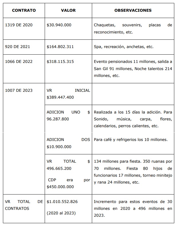 Manifiesta el denunciante presunto detrimento patrimonial y malversación de fondos en procesos de contratación por parte del anterior Alcalde de Tunja Luis Alejandro Fúneme (Alcalde de Tunja 2020-2023), que tenían por objeto la “Prestación de servicios logísticos para llevar a cabo las actividades enmarcadas en el plan de bienestar, estímulos e incentivos de la administración central de la alcaldía de Tunja”.
